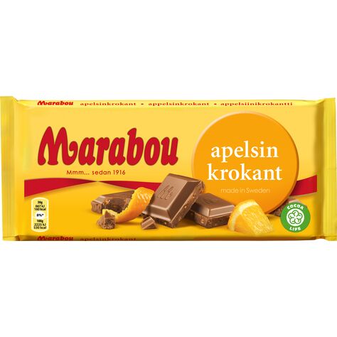 Marabou Apelsin Krokant 100g - En Marabou mjölkchokladkaka med apelsinsmak och krispiga bitar av mandelkrokant.