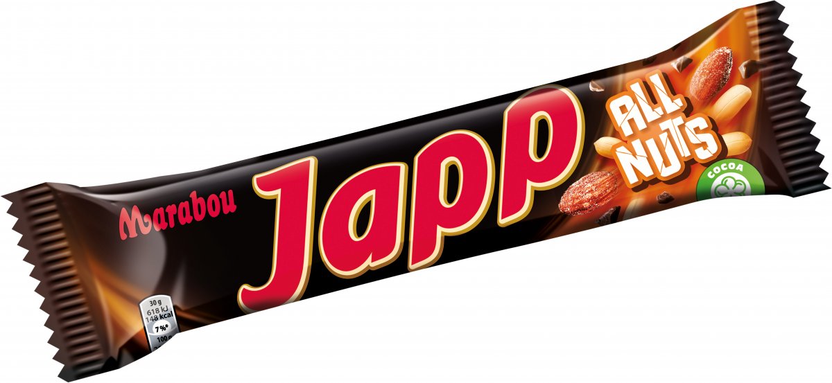 Marabou Japp All Nuts 60g - En utmärkt kombination av mjuk kola, sega chokladmarängen och goda mjölkchokladen med energigivande jordnötter och salta karamelliserade mandlar.