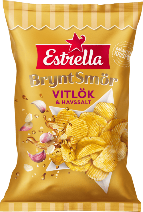 Estrella Västkustchips Brynt Smör, Vitlök & Havssalt är en smakrik och krispig chipsvariant som kombinerar det nötiga, karamelliserade inslaget från brynt smör med ett aromatiskt vitlöksting och en balanserad sälta från havssalt. Chipsen är räfflade och framställda av svensk potatis, vilket ger en premiumkänsla i varje tugga. Förpackas i praktiska 175 g-påsar, perfekta för evenemang, butik eller hemmamys