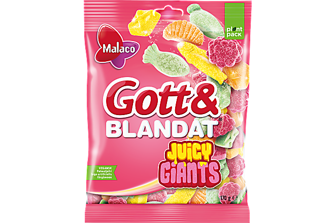 Gott & Blandat Juicy Giants Sour 27x130g är extra stora och fruktiga gelébitar med syrlig smak, en variant på den klassiska Gott & Blandat-serien från Malaco. Den större storleken på bitarna kombinerat med en fräsch syrlighet gör dem till ett modernt och efterfrågat tillskott i godishyllan. Förpackade i 130 g-påsar och levererade i 27-pack – perfekt för kiosker, servicehandel och livsmedelsbutiker som vill erbjuda ett starkt säljande godisalternativ.