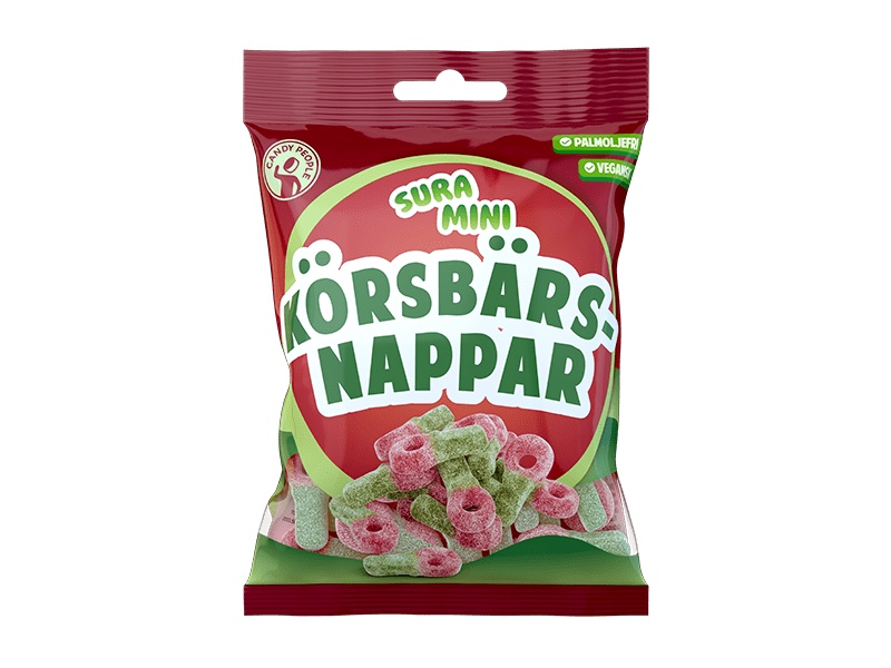 Sura Mini Körsbärsnappar 18x70g C People är färgglada gelégodisar formade som körsbär, med en syrlig smak som uppskattas av både barn och vuxna. Varje påse innehåller 70 gram och levereras i praktiskt 18-pack, vilket gör produkten idealisk för kiosker, servicehandel och livsmedelsbutiker som vill erbjuda en populär och säljande godisartikel.