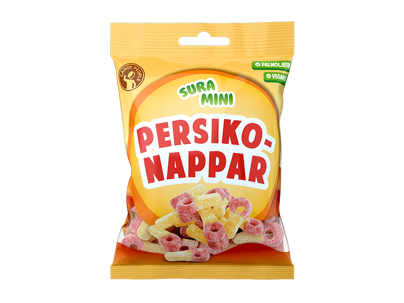 Sura Mini Persikonappar 18x70g C.People är syrliga gelégodisar med smak av solmogna persikor, formade som små nappfigurer. Den fruktiga smaken i kombination med syrlig yta gör dem till en populär favorit bland både barn och vuxna. Förpackade i 70 g-påsar och levererade i praktiskt 18-pack – perfekt för kiosker, servicehandel och livsmedelsbutiker som vill erbjuda ett omtyckt och säljande godissortiment.