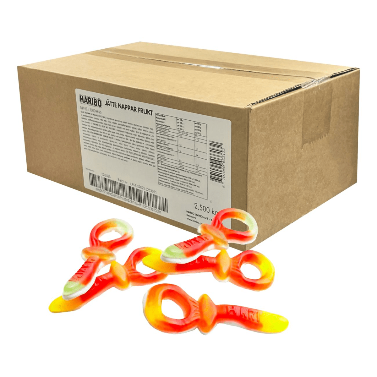 Haribo Jättenappar Frukt 2,5kg Kartong - Jättenappar Frukt Storpack innehåller jättenappar med fruktsmak. Säljs i storpack om 2,5 kg.