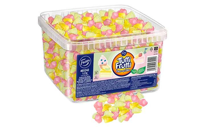 Tutti Frutti Piece of Cake 2,2kg - Tutti Frutti Piece of cake är en utsökt blandning av cupcakes och tårtbitar med fräscha fruktsmaker: kiwi-citron-lime, blåbär-vanilj & jordgubb-banan. Den läckra fruktgodisblandningen är en gelatinfri veganprodukt som tillverkas med naturliga färg och smakämnen. Fyll lösgodispåsen med de söta cupcakes eller kombinera med andra lösgodissorter.