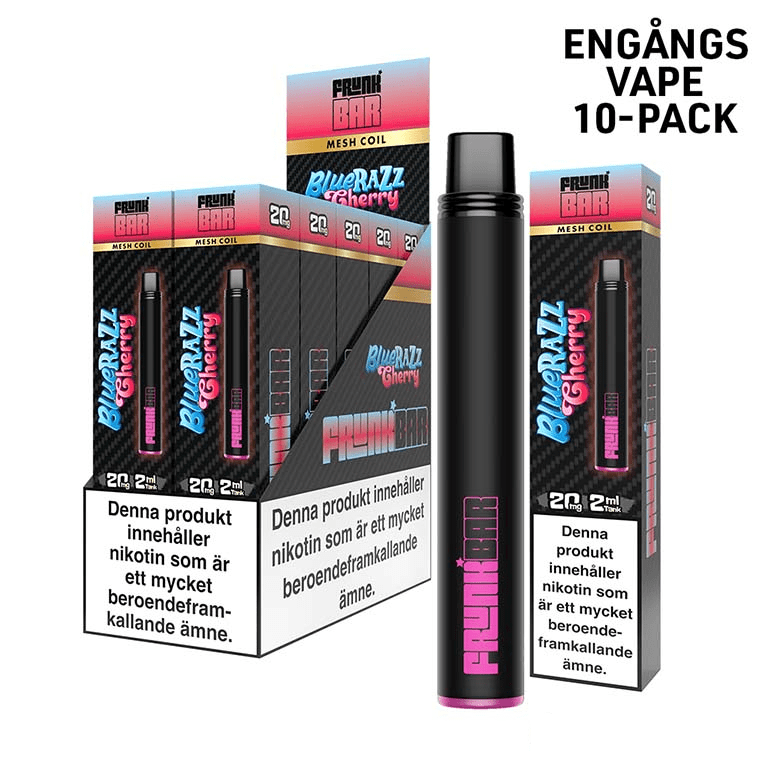 Frunk Bar Mesh är en engångs e-cigarett med 2 ml e-vätska innehållande 20 mg/ml nikotinsalt. Enheten är utrustad med mesh-coil för jämn uppvärmning. Aktiveras automatiskt vid inandning och kräver ingen laddning eller påfyllning.