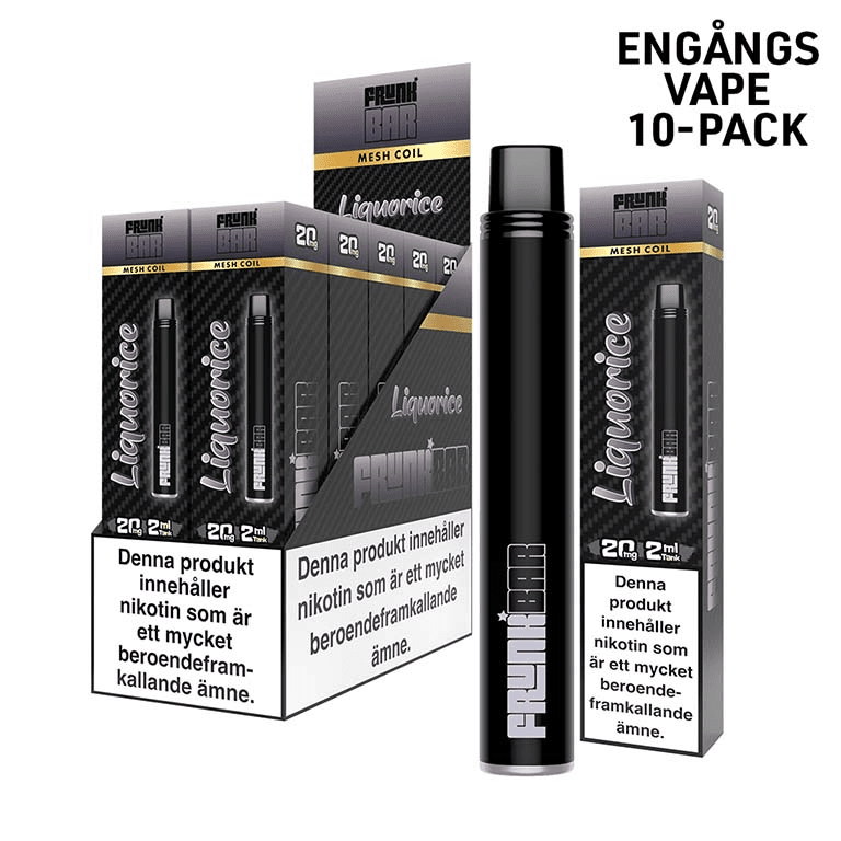 Frunk Bar Mesh är en engångs e-cigarett med 2 ml e-vätska innehållande 20 mg/ml nikotinsalt. Enheten är utrustad med mesh-coil för jämn uppvärmning. Aktiveras automatiskt vid inandning och kräver ingen laddning eller påfyllning