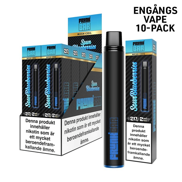 Frunk Bar Mesh är en engångs e-cigarett med 2 ml e-vätska innehållande 20 mg/ml nikotinsalt. Enheten är utrustad med mesh-coil för jämn uppvärmning. Aktiveras automatiskt vid inandning och kräver ingen laddning eller påfyllning.